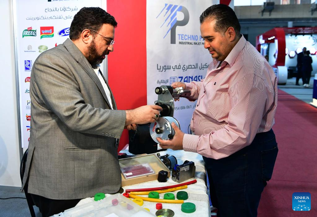 An exhibitor shows a product to a visitor during a plastic ware fair in Damascus, Syria, on April 28, 2023. (Photo by Ammar Safarjalani/Xinhua)