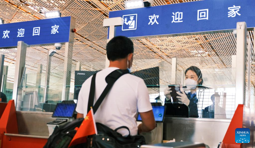 A police officer handles entry formalities for a Chinese national at Beijing Capital International Airport, in Beijing, capital of China, April 29, 2023. The first charter flight carrying Chinese nationals evacuated from Sudan arrived at Beijing Capital International Airport from Jeddah, Saudi Arabia, on Saturday morning. (Photo by Wang Chunhui/Xinhua)