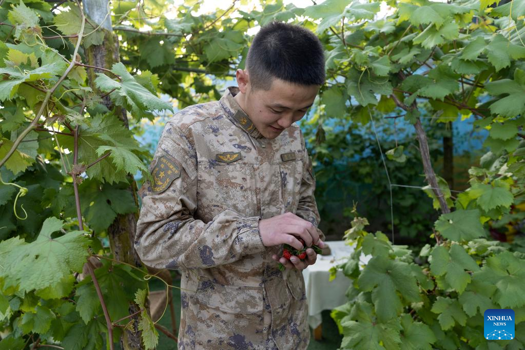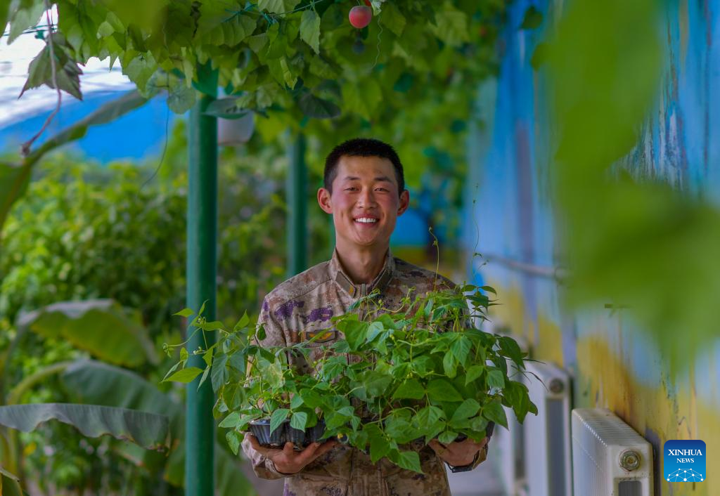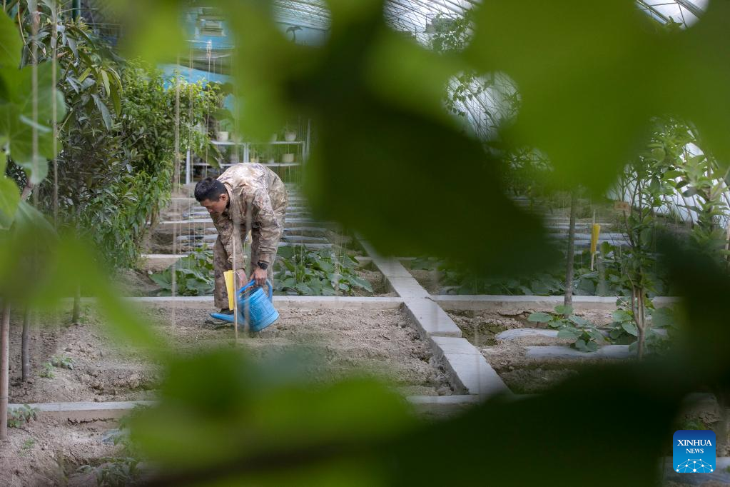 A soilder works in the greenhouse in Khunjerab, northwest China's Xinjiang Uygur Autonomous Region, April 13, 2023. Gao Guanghui, a recruit who had just joined the army for 7 months, was shocked when he walked into the honor room of the border defense regiment in Khunjerab, northwest China's Xinjiang Uygur Autonomous Region.