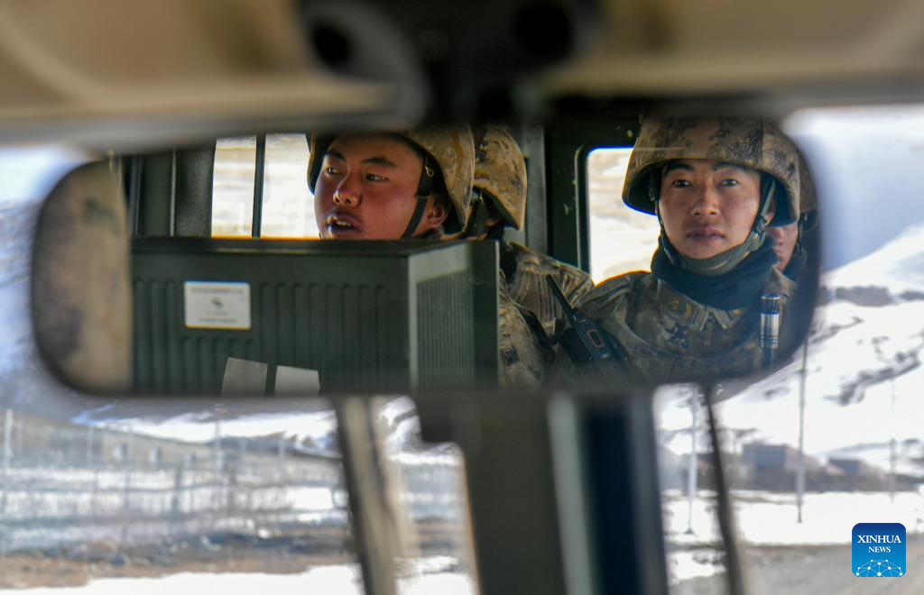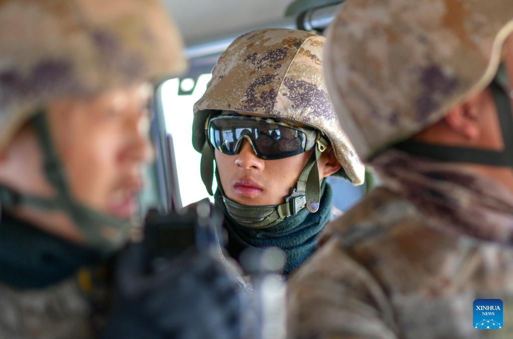 Zhou Linping (R) patrols in a car with other soldiers in Khunjerab, northwest China's Xinjiang Uygur Autonomous Region, April 14, 2023. Gao Guanghui, a recruit who had just joined the army for 7 months, was shocked when he walked into the honor room of the border defense regiment in Khunjerab, northwest China's Xinjiang Uygur Autonomous Region.