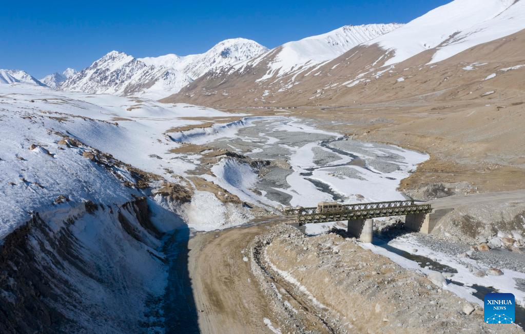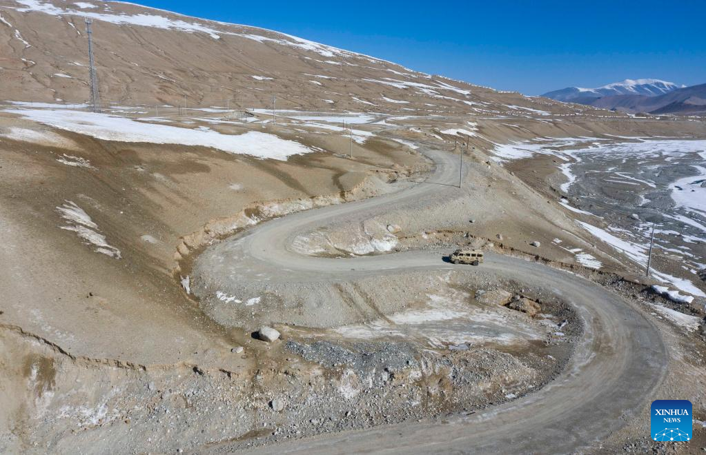 This aerial photo shows soldiers patrolling in a car in Khunjerab, northwest China's Xinjiang Uygur Autonomous Region, April 14, 2023. Gao Guanghui, a recruit who had just joined the army for 7 months, was shocked when he walked into the honor room of the border defense regiment in Khunjerab, northwest China's Xinjiang Uygur Autonomous Region.