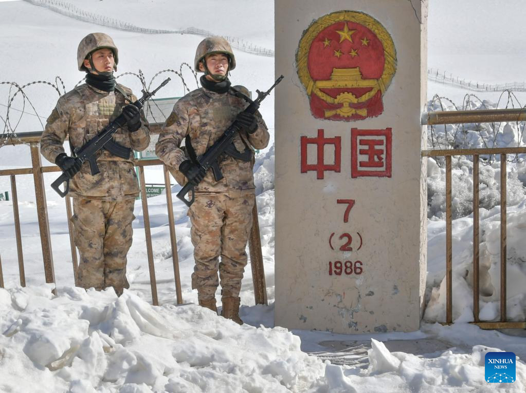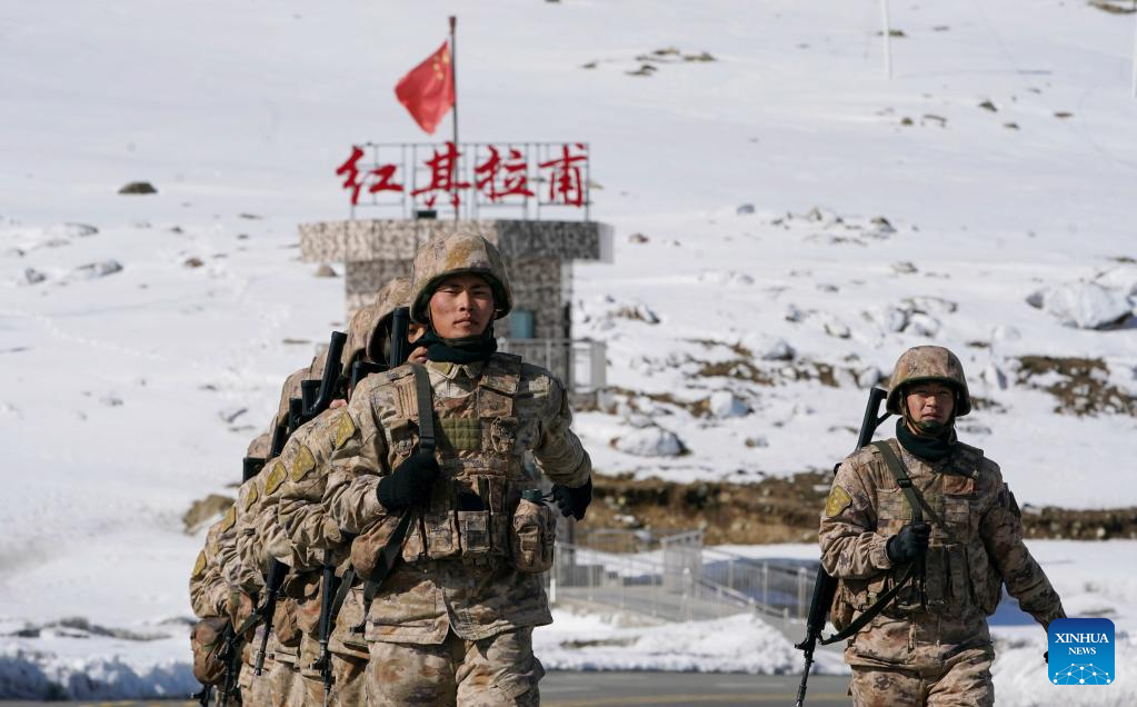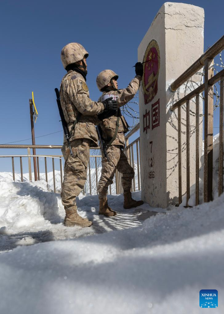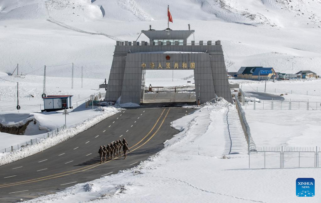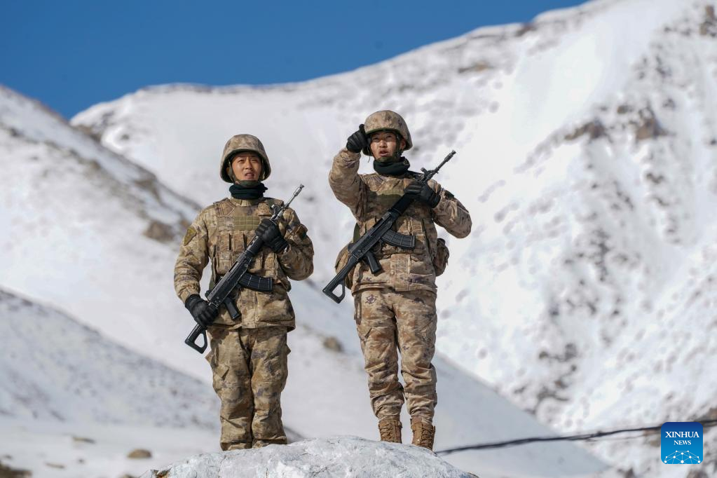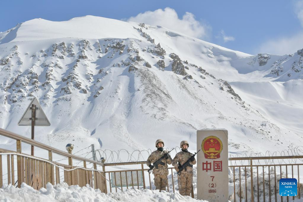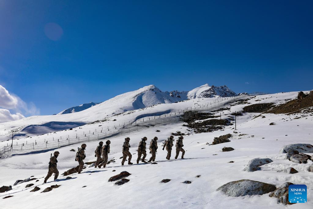 Soldiers patrol in Khunjerab, northwest China's Xinjiang Uygur Autonomous Region, April 13, 2023. Gao Guanghui, a recruit who had just joined the army for 7 months, was shocked when he walked into the honor room of the border defense regiment in Khunjerab, northwest China's Xinjiang Uygur Autonomous Region.