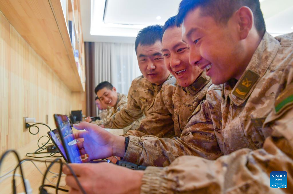 Soldiers use electronic devices in a reading room at the barrack in Khunjerab, northwest China's Xinjiang Uygur Autonomous Region, April 13, 2023. Gao Guanghui, a recruit who had just joined the army for 7 months, was shocked when he walked into the honor room of the border defense regiment in Khunjerab, northwest China's Xinjiang Uygur Autonomous Region.