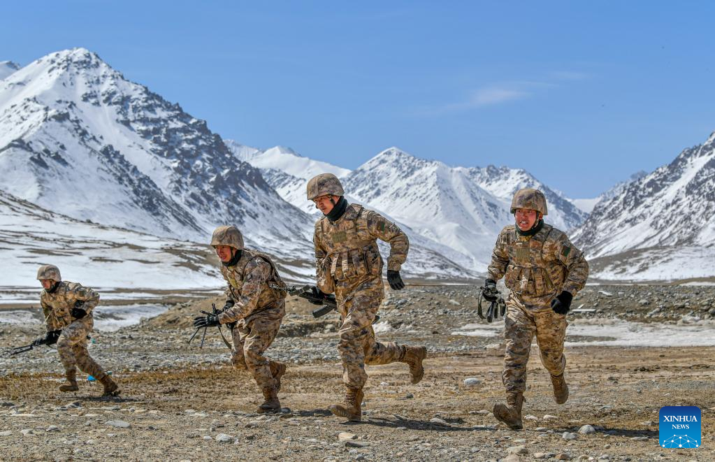 Soldiers take part in a training session in Khunjerab, northwest China's Xinjiang Uygur Autonomous Region, April 13, 2023. Gao Guanghui, a recruit who had just joined the army for 7 months, was shocked when he walked into the honor room of the border defense regiment in Khunjerab, northwest China's Xinjiang Uygur Autonomous Region.