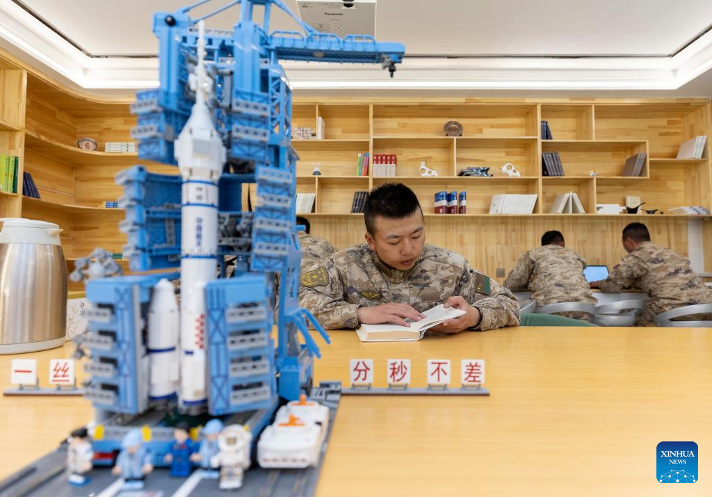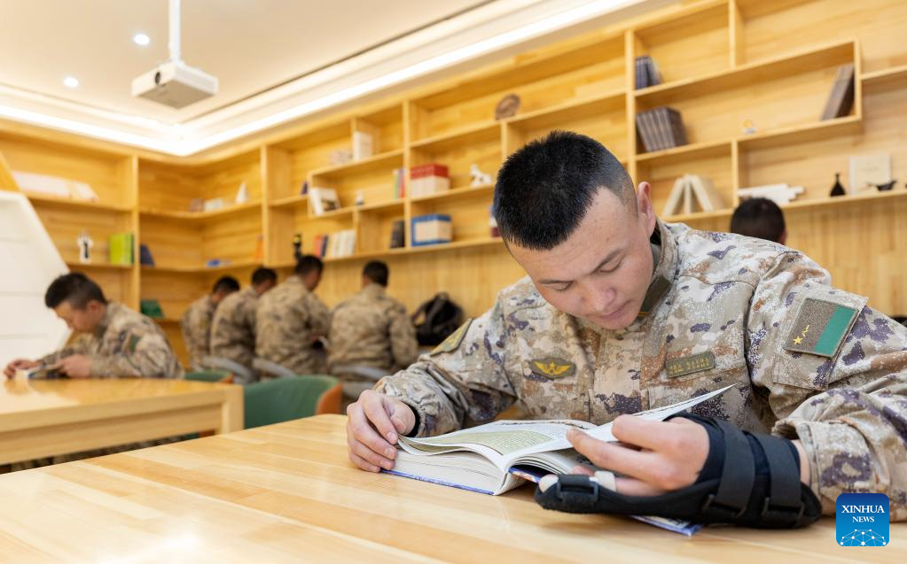 Soldiers read books in a reading room at the barrack in Khunjerab, northwest China's Xinjiang Uygur Autonomous Region, April 13, 2023. Gao Guanghui, a recruit who had just joined the army for 7 months, was shocked when he walked into the honor room of the border defense regiment in Khunjerab, northwest China's Xinjiang Uygur Autonomous Region.