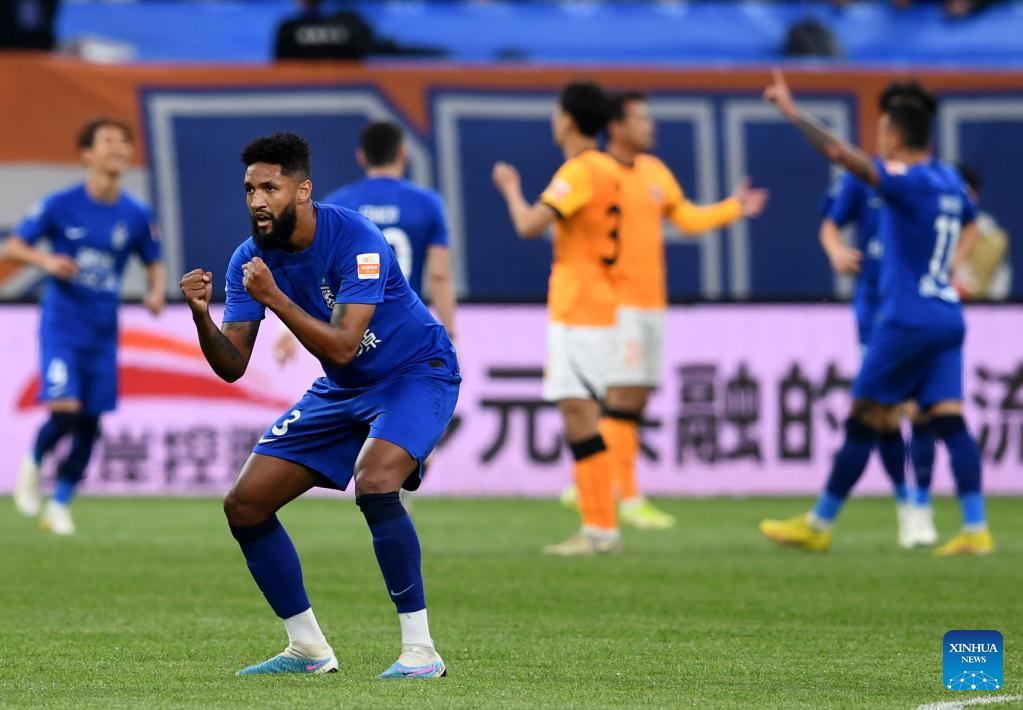 Wallace (front) of Wuhan Three Towns celebrates after his team scored a goal during a 2023 season Chinese Football Association Super League (CSL) fourth round match between Wuhan Three Towns and Qingdao Hainiu in Qingdao of east China's Shandong Province, April 29, 2023. (Xinhua/Li Ziheng)