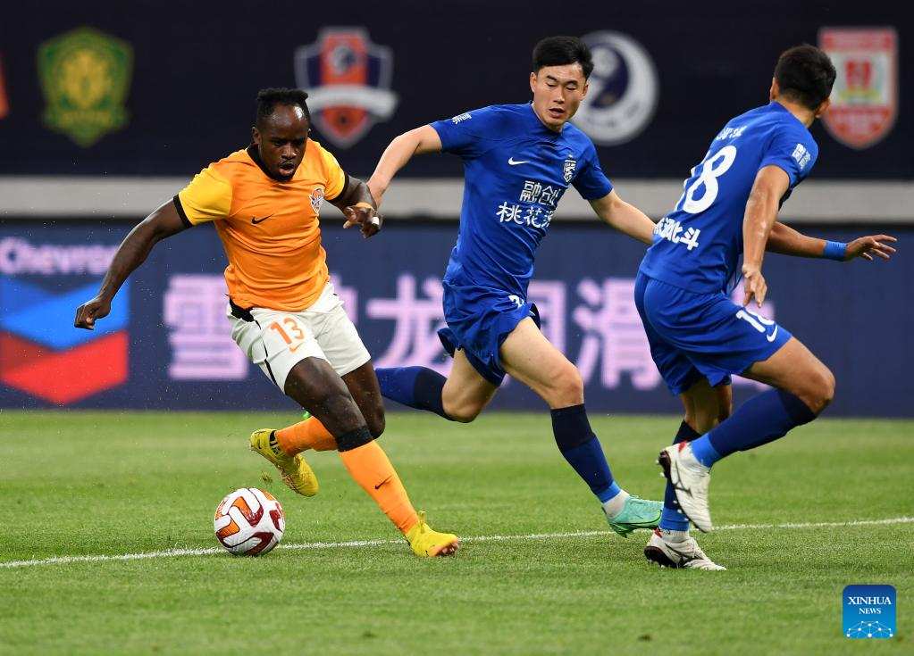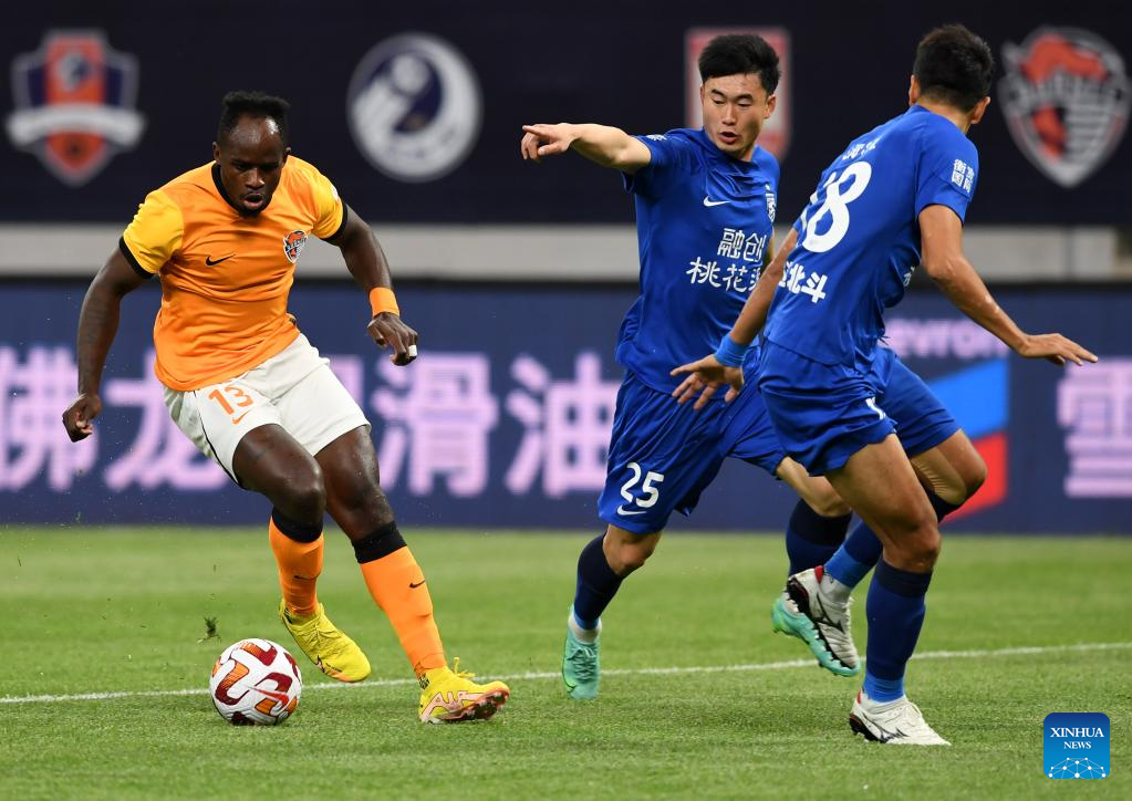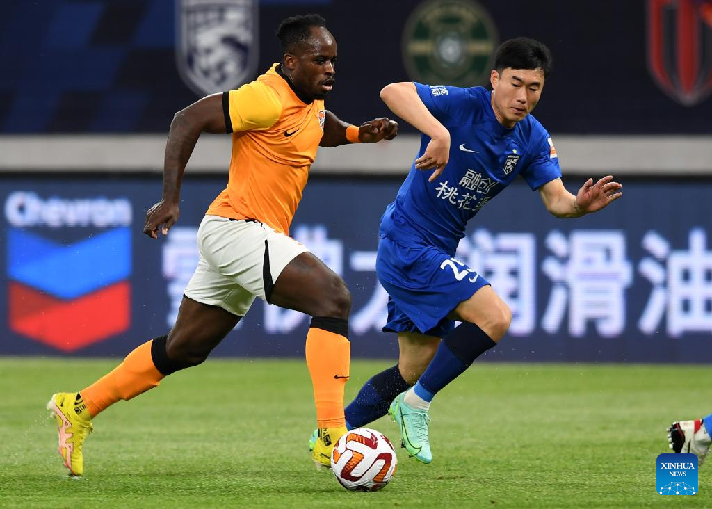 Serge Tabekou (L) of Qingdao Hainiu competes during a 2023 season Chinese Football Association Super League (CSL) fourth round match between Wuhan Three Towns and Qingdao Hainiu in Qingdao of east China's Shandong Province, April 29, 2023. (Xinhua/Li Ziheng)