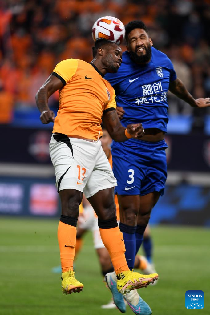 Serge Tabekou (L) of Qingdao Hainiu vies with Wallace of Wuhan Three Towns during a 2023 season Chinese Football Association Super League (CSL) fourth round match between Wuhan Three Towns and Qingdao Hainiu in Qingdao of east China's Shandong Province, April 29, 2023. (Xinhua/Li Ziheng)
