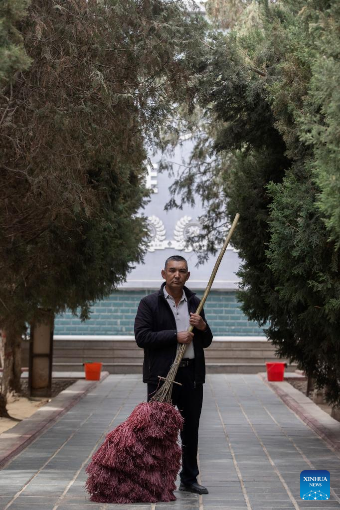 Eniwar Emer picks a broom to sweep the cemetery at a local market in Yecheng, northwest China's Xinjiang Uygur Autonomous Region, April 16, 2023.