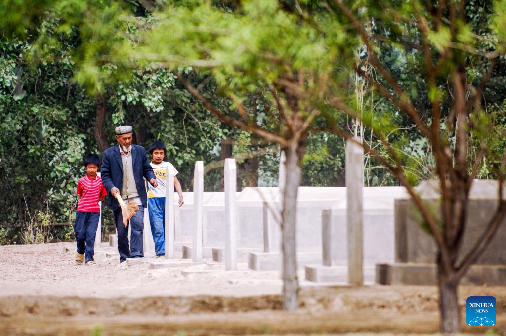 Eniwar Emer sweeps the ground in the Yecheng Martyrs Cemetery in Yecheng, northwest China's Xinjiang Uygur Autonomous Region, April 16, 2023.