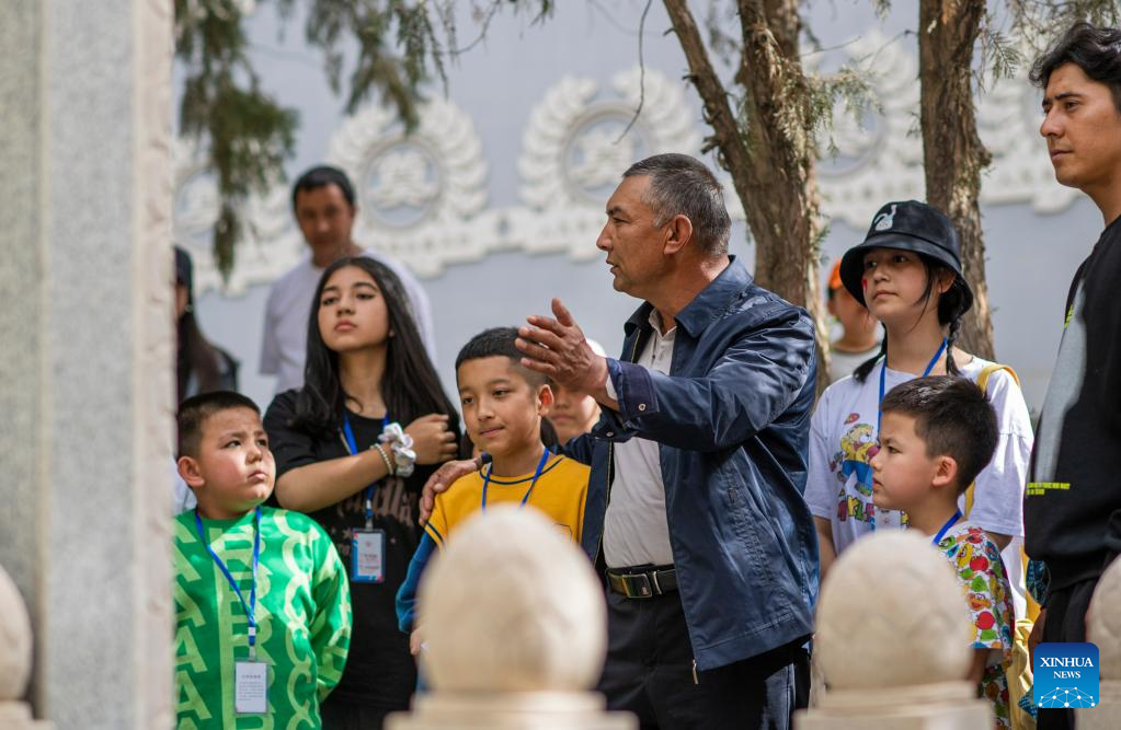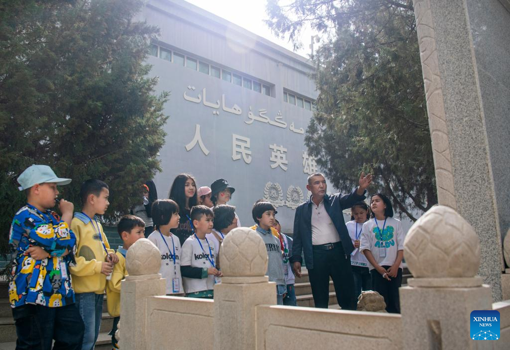 Eniwar Emer (R, rear) tells stories about the martyrs to the visitors in the Yecheng Martyrs Cemetery in Yecheng, northwest China's Xinjiang Uygur Autonomous Region, April 16, 2023.