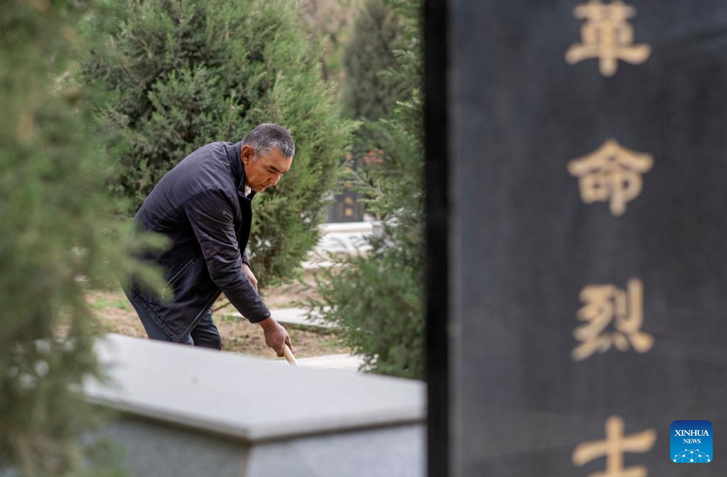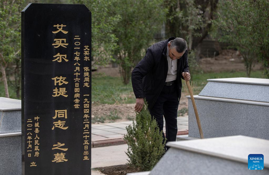 Eniwar Emer wipes a tombstone in the Yecheng Martyrs Cemetery in Yecheng, northwest China's Xinjiang Uygur Autonomous Region, April 16, 2023.