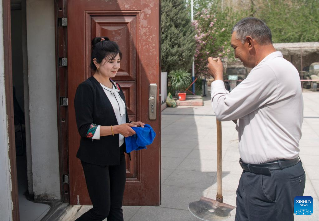 Eniwar Emer (R) takes a towel from his wife after weeding in the Yecheng Martyrs Cemetery in Yecheng, northwest China's Xinjiang Uygur Autonomous Region, April 16, 2023.