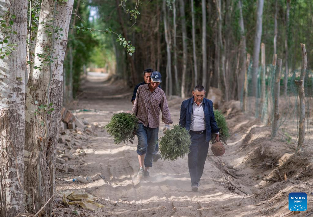 Eniwar Emer checks the growth of tree seedlings in the Yecheng Martyrs Cemetery in Yecheng, northwest China's Xinjiang Uygur Autonomous Region, April 16, 2023.