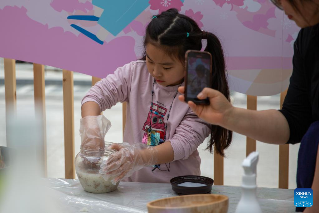 A child learns making local cuisine at the Gwanghwamun Square during the Seoul Festa 2023 in Seoul, South Korea, April 30, 2023. The eight-day Seoul Festa 2023 opened on Sunday featuring entertaining programs for both domestic and international tourists to "feel the real Seoul." (Xinhua/Wang Yiliang)