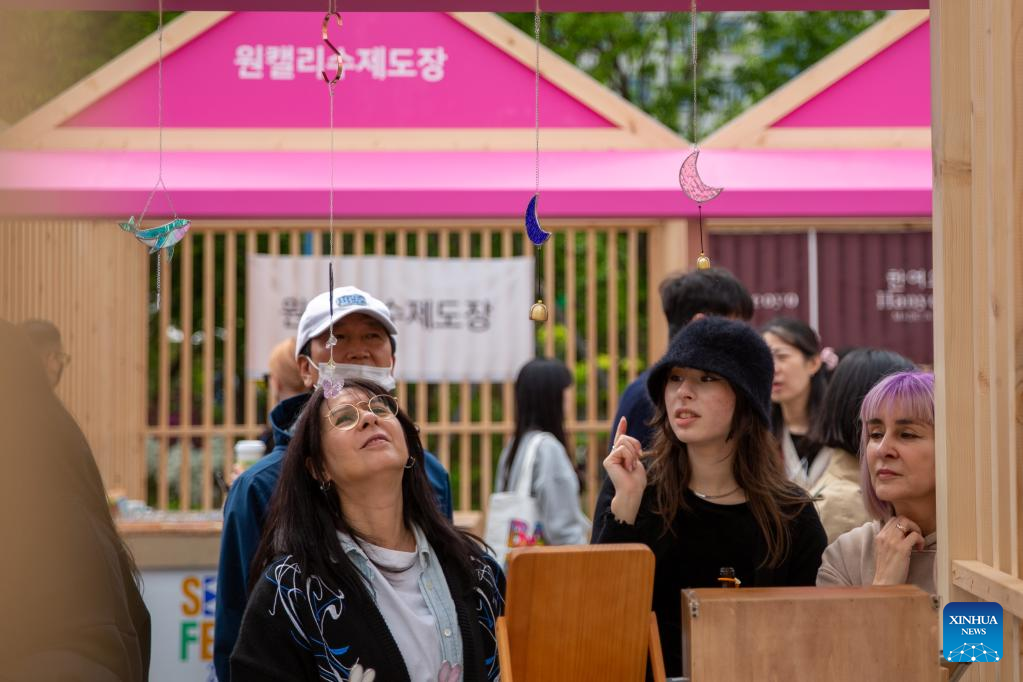 Visitors look at wind chimes at the Gwanghwamun Square during the Seoul Festa 2023 in Seoul, South Korea, April 30, 2023. The eight-day Seoul Festa 2023 opened on Sunday featuring entertaining programs for both domestic and international tourists to "feel the real Seoul." (Xinhua/Wang Yiliang)