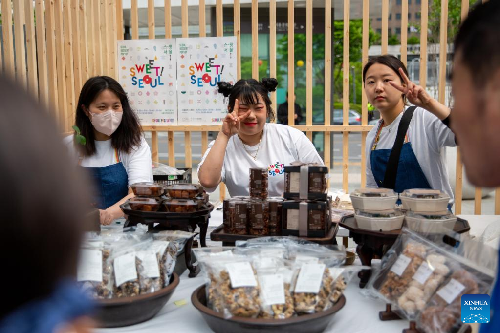 This photo taken on April 30, 2023 shows a snack booth at the Gwanghwamun Square during the Seoul Festa 2023 in Seoul, South Korea. The eight-day Seoul Festa 2023 opened on Sunday featuring entertaining programs for both domestic and international tourists to "feel the real Seoul." (Xinhua/Wang Yiliang)