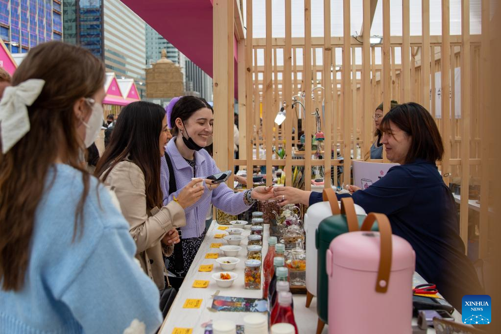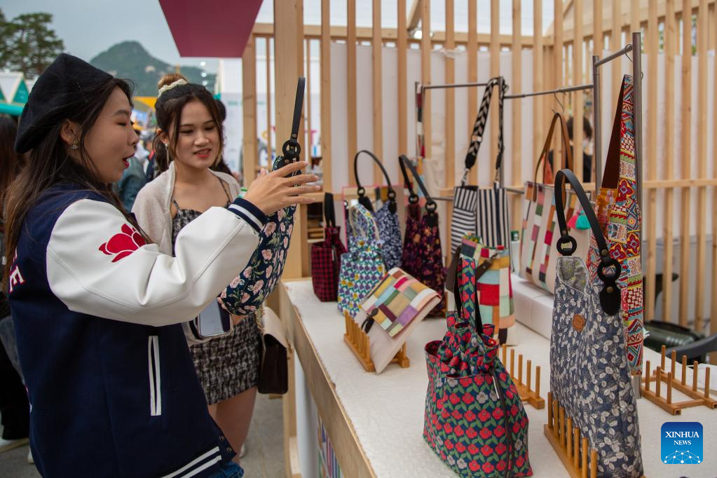 Visitors choose products at the Gwanghwamun Square during the Seoul Festa 2023 in Seoul, South Korea, April 30, 2023. The eight-day Seoul Festa 2023 opened on Sunday featuring entertaining programs for both domestic and international tourists to "feel the real Seoul." (Xinhua/Wang Yiliang)