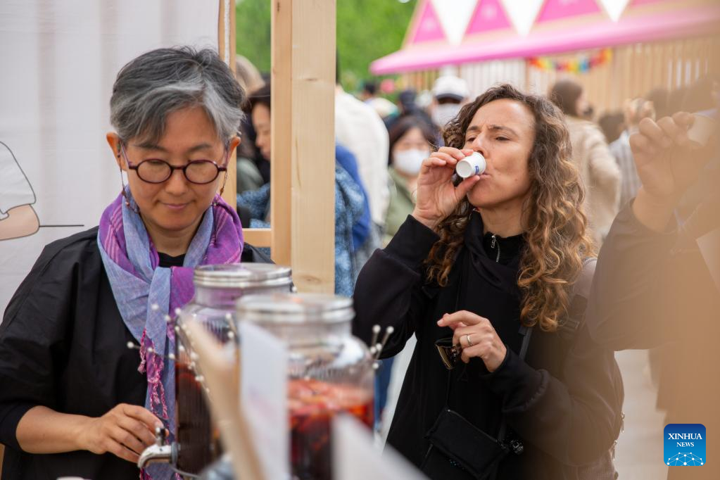 Visitors try beverages at the Gwanghwamun Square during the Seoul Festa 2023 in Seoul, South Korea, April 30, 2023. The eight-day Seoul Festa 2023 opened on Sunday featuring entertaining programs for both domestic and international tourists to "feel the real Seoul." (Xinhua/Wang Yiliang)