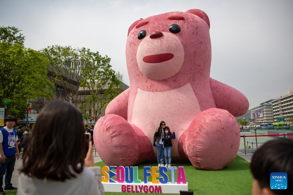 Visitors pose with a large puppet at the Gwanghwamun Square during the Seoul Festa 2023 in Seoul, South Korea, April 30, 2023. The eight-day Seoul Festa 2023 opened on Sunday featuring entertaining programs for both domestic and international tourists to "feel the real Seoul." (Xinhua/Wang Yiliang)