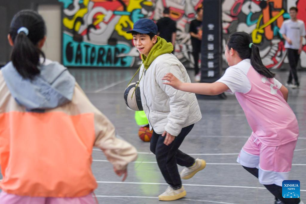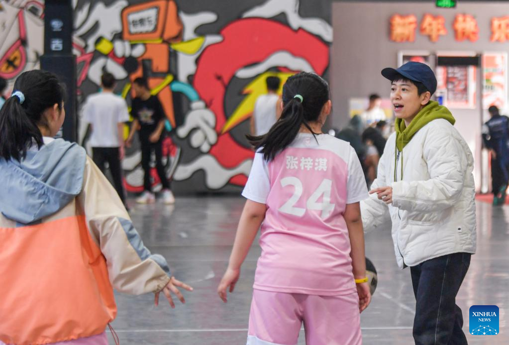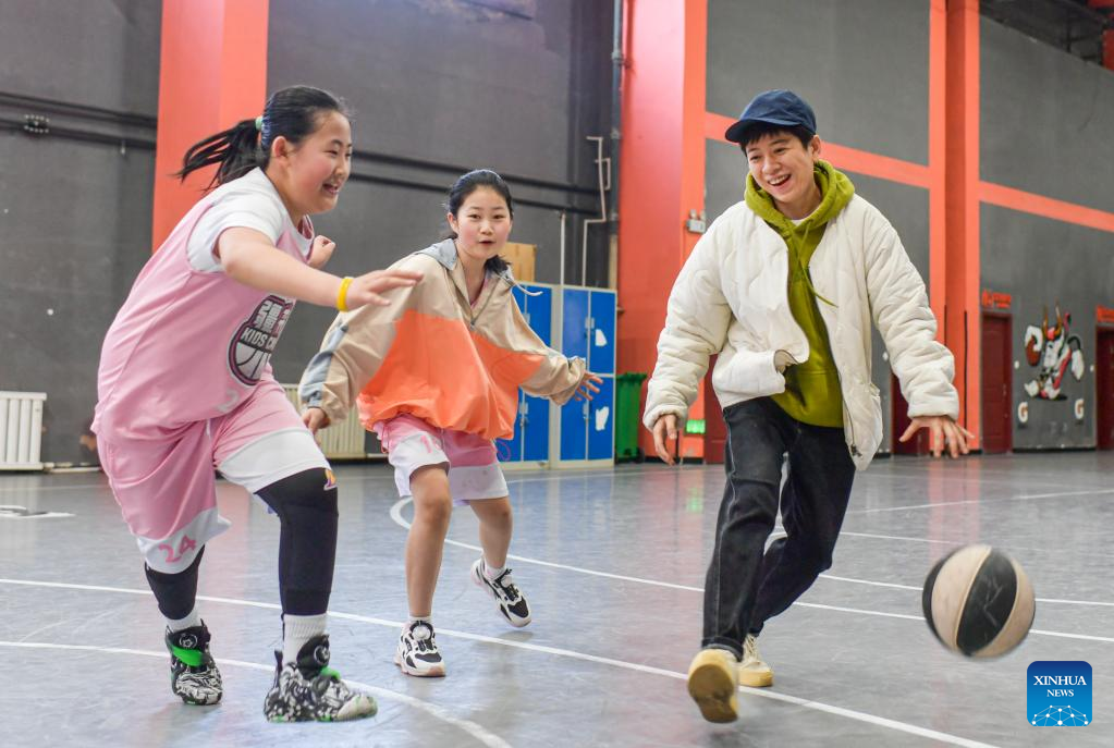 Wang Na (C) plays with girls from a basketball training camp organized by Jiang Lai Women's Basketball Club in Urumqi, northwest China's Xinjiang Uygur Autonomous Region, March 26, 2023. In Urumqi, a group of female basketball players have formed a basketball club named Jiang Lai. The club members are individuals from ethnic groups such as Han, Uygur, Kazak, Mongolian and Hui. According to Wang Na, the founder of the club, the name Jiang Lai means the team comes from Xinjiang.