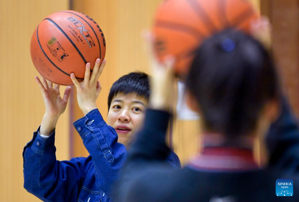 Wang Na (R) instructs girls from a basketball training camp organized by Jiang Lai Women's Basketball Club in Urumqi, northwest China's Xinjiang Uygur Autonomous Region, March 26, 2023. In Urumqi, a group of female basketball players have formed a basketball club named Jiang Lai. The club members are individuals from ethnic groups such as Han, Uygur, Kazak, Mongolian and Hui. According to Wang Na, the founder of the club, the name Jiang Lai means the team comes from Xinjiang.
