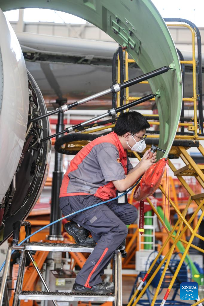 A worker of Grand China Aviation Maintenance Co., Ltd. (GCAM) maintains an airplane in Haikou, capital of south China's Hainan Province, May 5, 2023. An Airbus A320 airplane of Cambodia Airways was parked at a hangar of Hainan Free Trade Port's aircraft maintenance base to receive examination and maintenance services provided by GCAM on Friday. (Xinhua/Zhang Liyun)