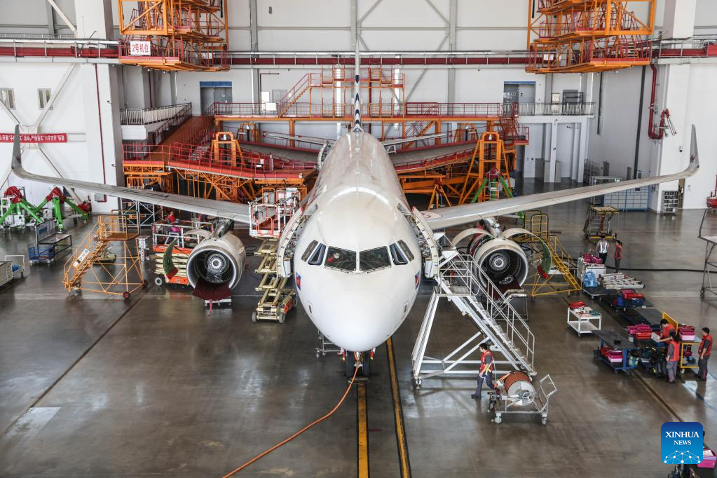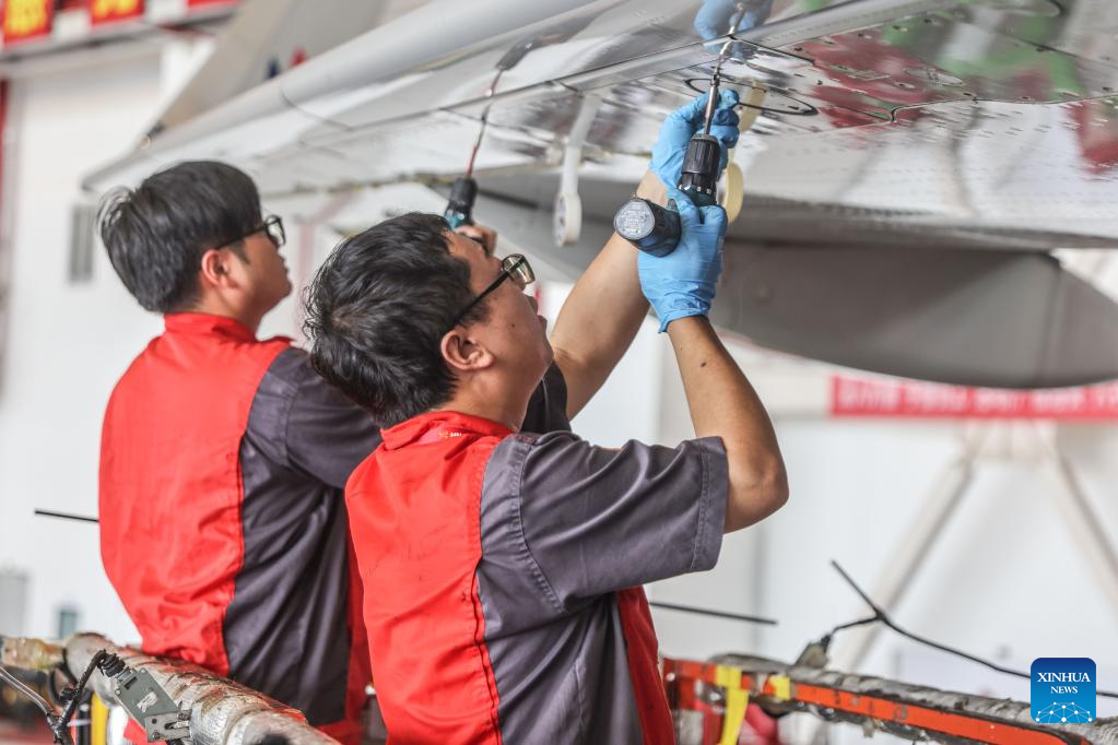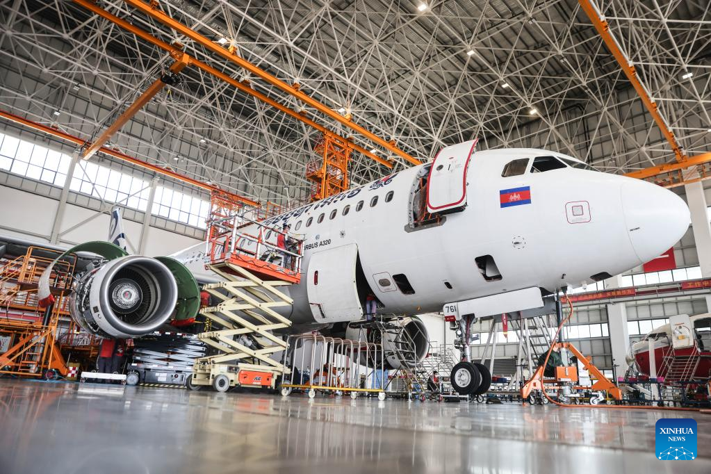 Workers of Grand China Aviation Maintenance Co., Ltd. (GCAM) maintain an airplane in Haikou, capital of south China's Hainan Province, May 5, 2023. An Airbus A320 airplane of Cambodia Airways was parked at a hangar of Hainan Free Trade Port's aircraft maintenance base to receive examination and maintenance services provided by GCAM on Friday. (Xinhua/Zhang Liyun)