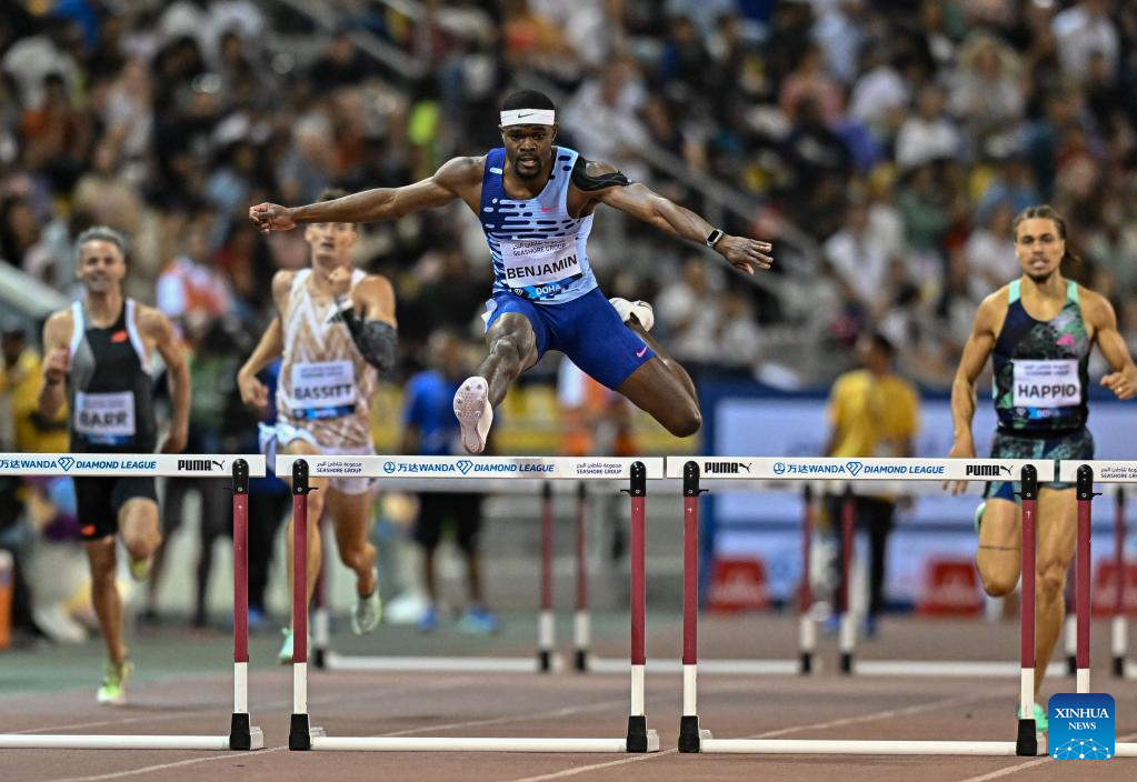 Rai Benjamin (Front) of the United States competes during the men's 400m hurdles race at the 2023 Diamond League athletics meeting at Suhaim bin Hamad Stadium in Doha, capital of Qatar, May 5, 2023. (Photo by Nikku/Xinhua)