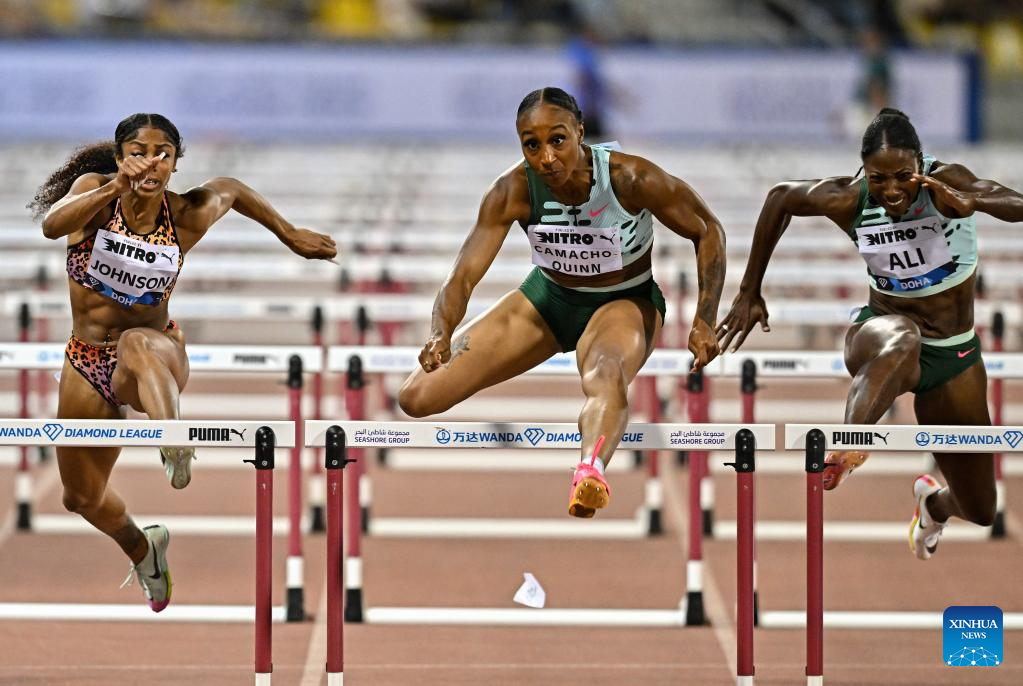 Jasmine Camacho-Quinn (C) of Puerto Rico competes during the women's 100m hurdles race at the 2023 Diamond League athletics meeting at Suhaim bin Hamad Stadium in Doha, capital of Qatar, May 5, 2023. (Photo by Nikku/Xinhua)