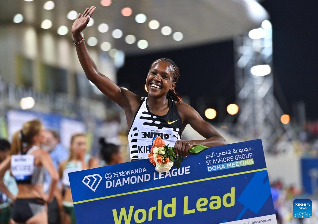 Gold medalist Faith Kipyegon of Kenya celebrates after winning women's 1500m race at the 2023 Diamond League athletics meeting at Suhaim bin Hamad Stadium in Doha, capital of Qatar, May 5, 2023. (Photo by Nikku/Xinhua)