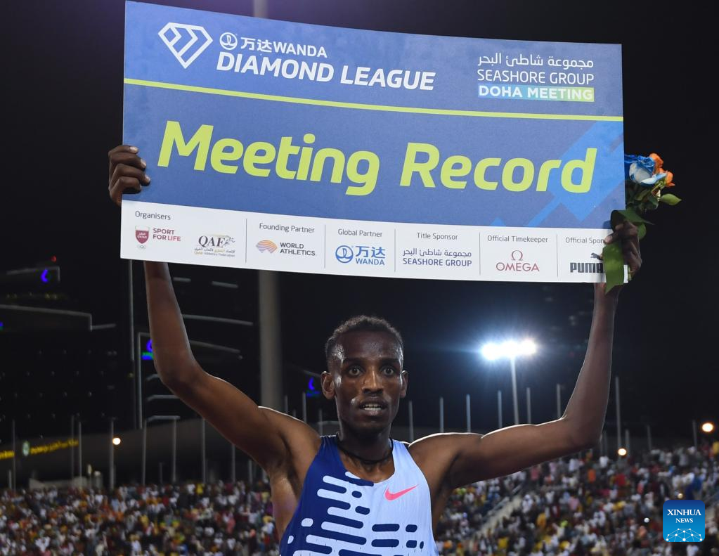 Gold medalist Lamecha Girma of Ethiopia celebrates after winning the men's 3000m race at the 2023 Diamond League athletics meeting at Suhaim bin Hamad Stadium in Doha, capital of Qatar, May 5, 2023. (Photo by Nikku/Xinhua)