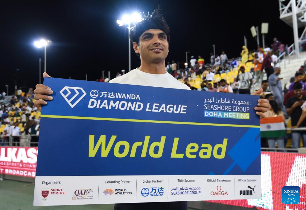 Gold medalist Neeraj Chopra of India celebrates after winning the men's Javelin Throw at the 2023 Diamond League athletics meeting at Suhaim bin Hamad Stadium in Doha, capital of Qatar, May 5, 2023. (Photo by Nikku/Xinhua)