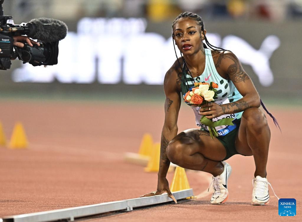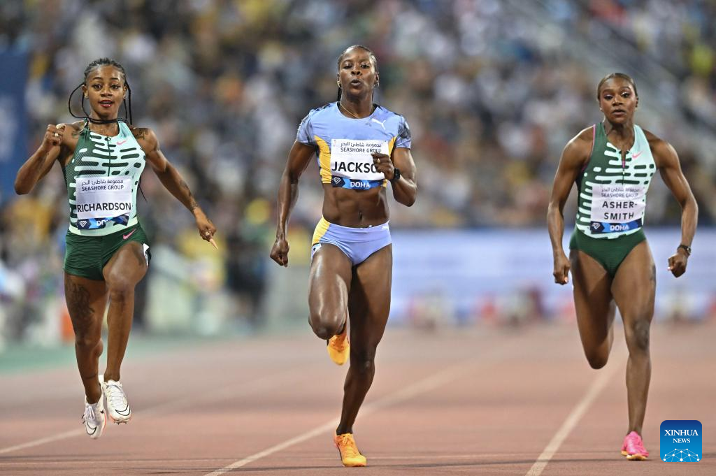 Sha'Carri Richardson (L) of the United States and Shericka Jackson (C) of Jamaica compete during the women's 100m race at the 2023 Diamond League athletics meeting at Suhaim bin Hamad Stadium in Doha, capital of Qatar, May 5, 2023. (Photo by Nikku/Xinhua)