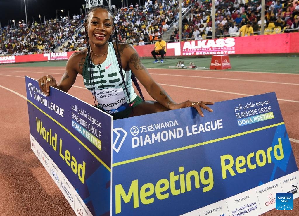 Sha'Carri Richardson of the United States celebrates after winning the women's 100m race at the 2023 Diamond League athletics meeting at Suhaim bin Hamad Stadium in Doha, capital of Qatar, May 5, 2023. (Photo by Nikku/Xinhua)