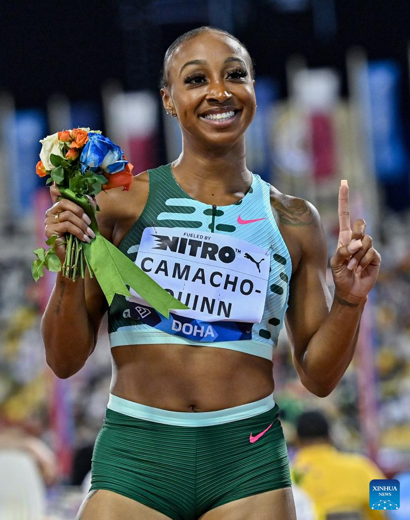 Gold medalist Jasmine Camacho-Quinn of Puerto Rico celebrates after winning the women's 100m hurdles race at the 2023 Diamond League athletics meeting at Suhaim bin Hamad Stadium in Doha, capital of Qatar, May 5, 2023. (Photo by Nikku/Xinhua)