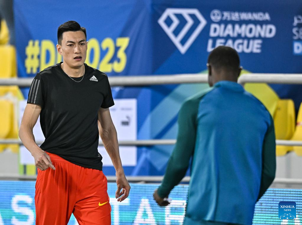 Zhu Yaming (L) of China reacts during the men's Triple Jump at the 2023 Diamond League athletics meeting at Suhaim bin Hamad Stadium in Doha, capital of Qatar, May 5, 2023. (Photo by Nikku/Xinhua)