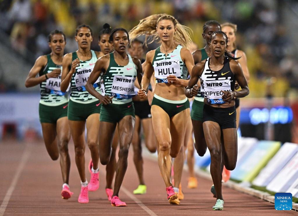 Faith Kipyegon (1st R) of Kenya competes during the women's 1500m race at the 2023 Diamond League athletics meeting at Suhaim bin Hamad Stadium in Doha, capital of Qatar, May 5, 2023. (Photo by Nikku/Xinhua)