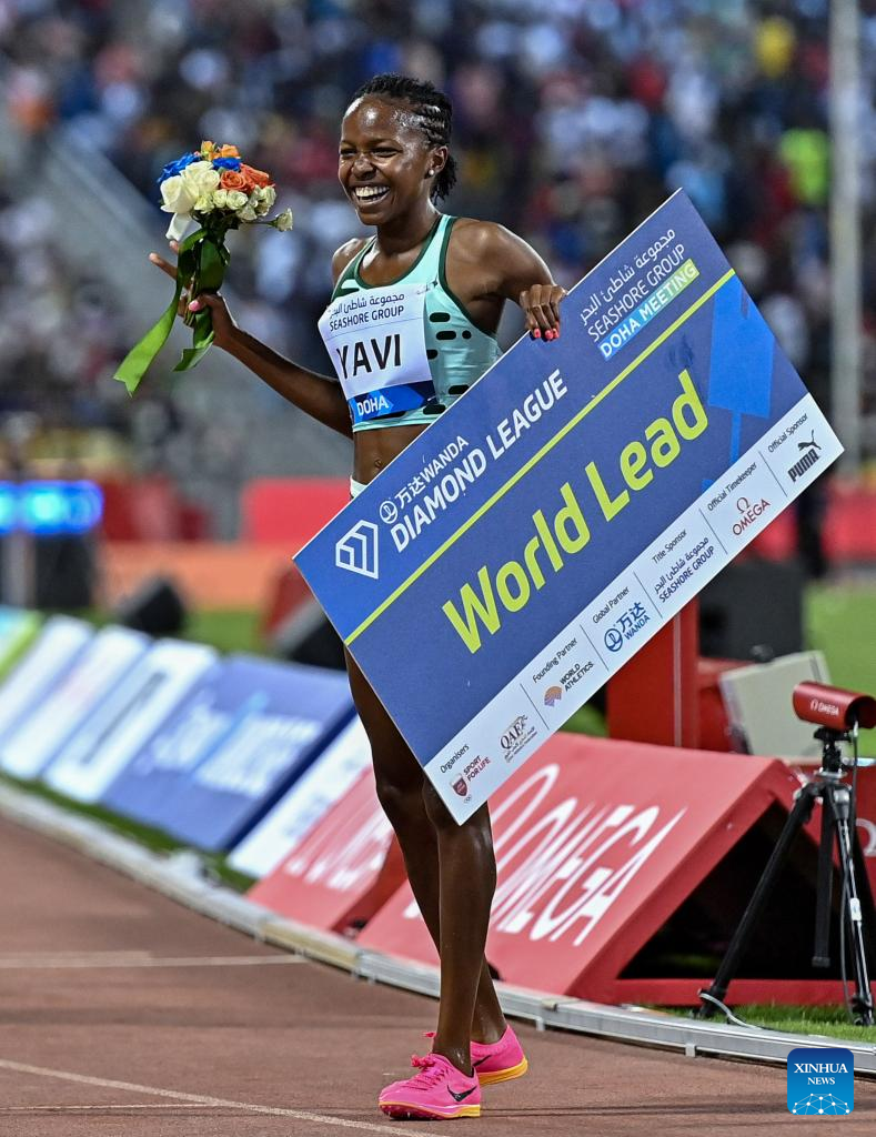 Winfred Mutile Yavi of Bahrain celebrates after winning the women's 3000m Steeplechase race at the 2023 Diamond League athletics meeting at Suhaim bin Hamad Stadium in Doha, capital of Qatar, May 5, 2023. (Photo by Nikku/Xinhua)