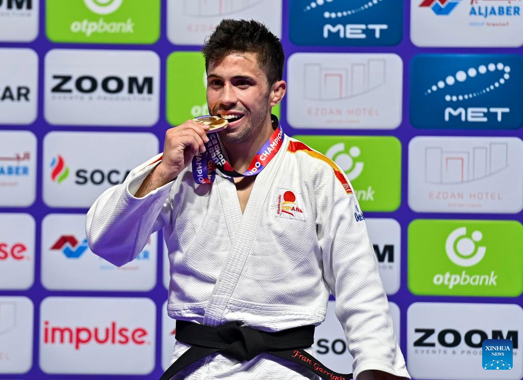 Gold medalist Francisco Garrigos of Spain poses on the podium after the men's 60kg category final at the World Judo Championships Doha 2023 in Doha, Qatar on May 7, 2023. (Photo by Nikku/Xinhua)