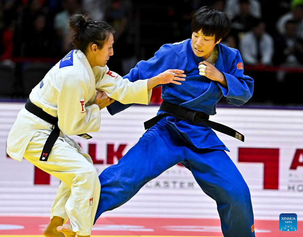 Laborde Maria Celia (R) of the United States and Tsunoda Natsumi of Japan compete during the 2nd round match of women's 48kg category at the World Judo Championships Doha 2023 in Doha, Qatar on May 7, 2023. (Photo by Nikku/Xinhua)