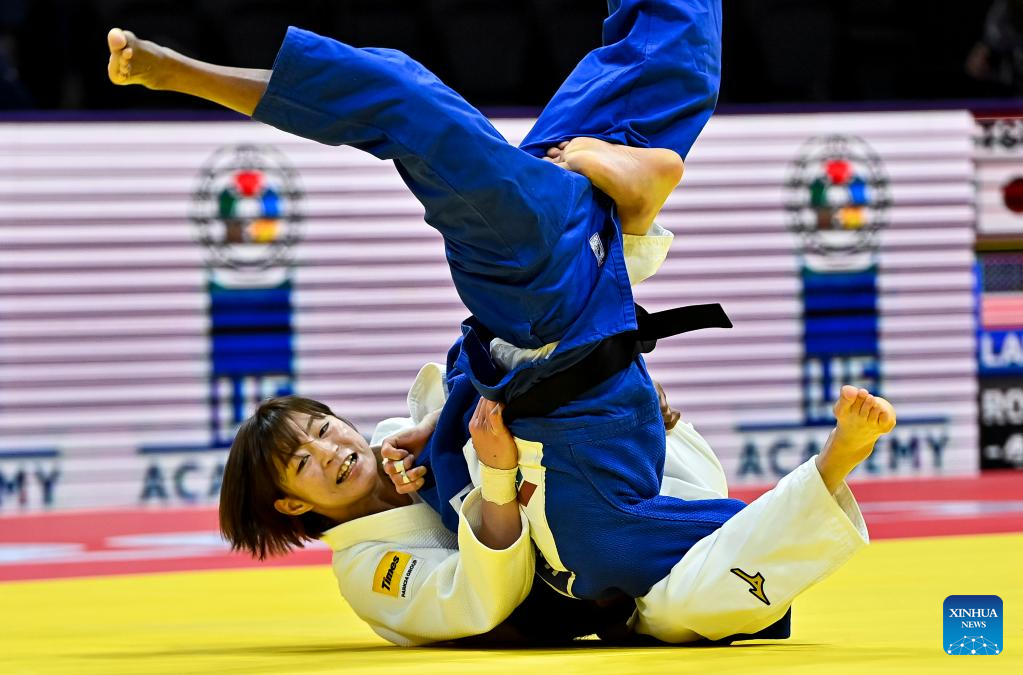 Guo Zongying (top) of China and Koga Wakana of Japan compete during the 2nd round match of women's 48kg category at the World Judo Championships Doha 2023 in Doha, Qatar on May 7, 2023. (Photo by Nikku/Xinhua)