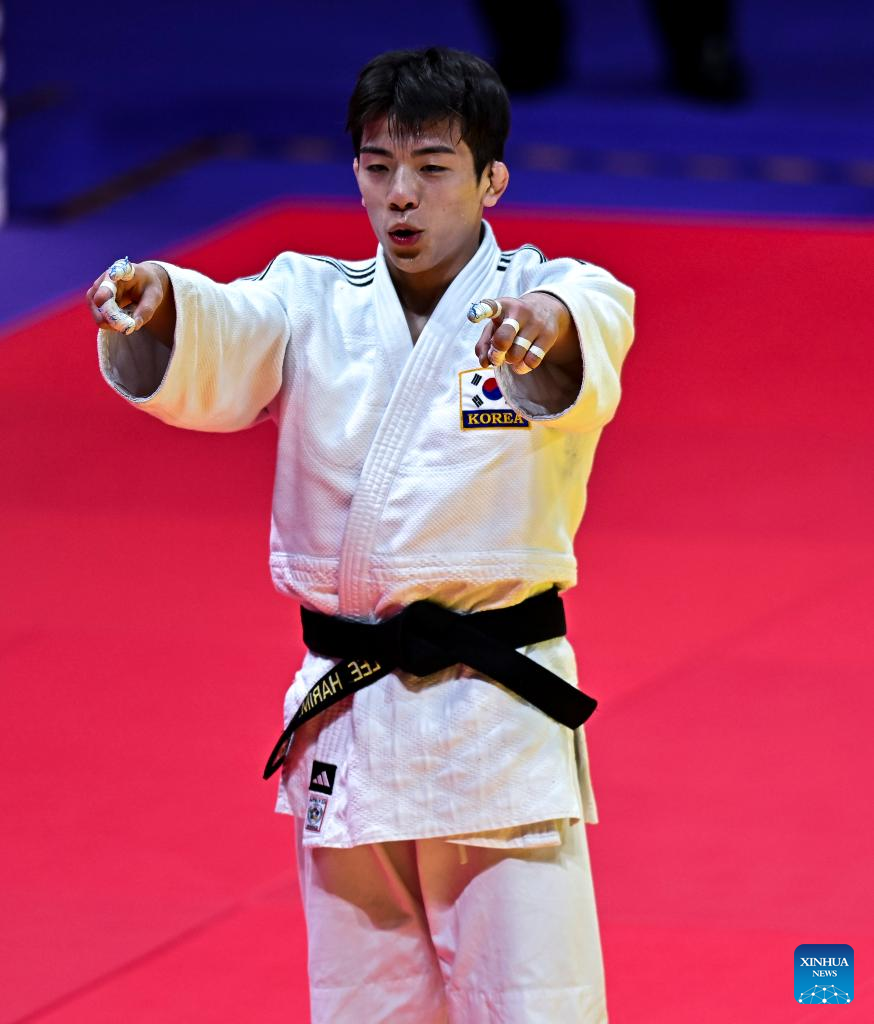 Lee Harim of South Korea reacts during the men's 60kg category bronze medal bout against Takato Naohisa of Japan at the World Judo Championships Doha 2023 in Doha, Qatar on May 7, 2023. (Photo by Nikku/Xinhua)