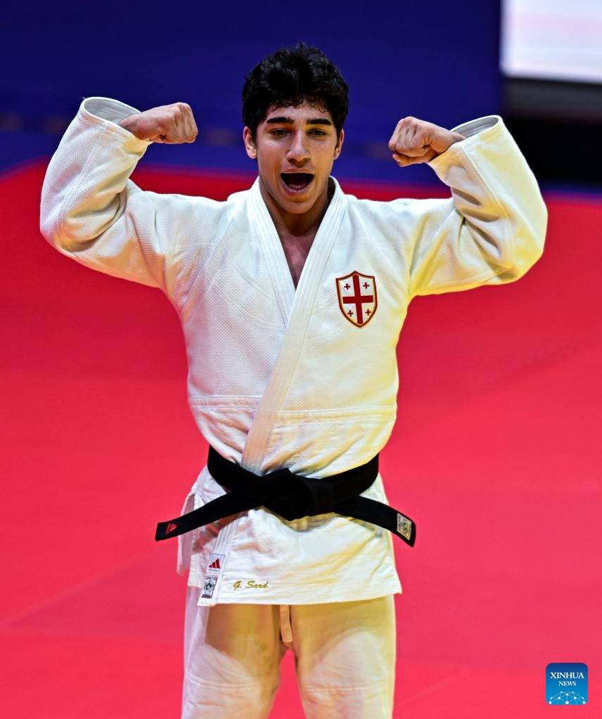 Giorgi Sardalashvili of Georgia reacts during the men's 60kg category bronze medal bout against Jorre Verstraeten of Belgium at the World Judo Championships Doha 2023 in Doha, Qatar on May 7, 2023. (Photo by Nikku/Xinhua)