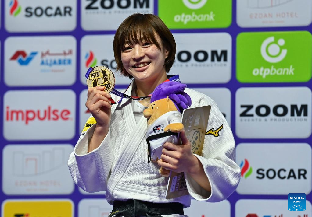 Gold medalist Tsunoda Natsumi of Japan poses on the podium after the women's 48kg category at the World Judo Championships Doha 2023 in Doha, Qatar on May 7, 2023. (Photo by Nikku/Xinhua)