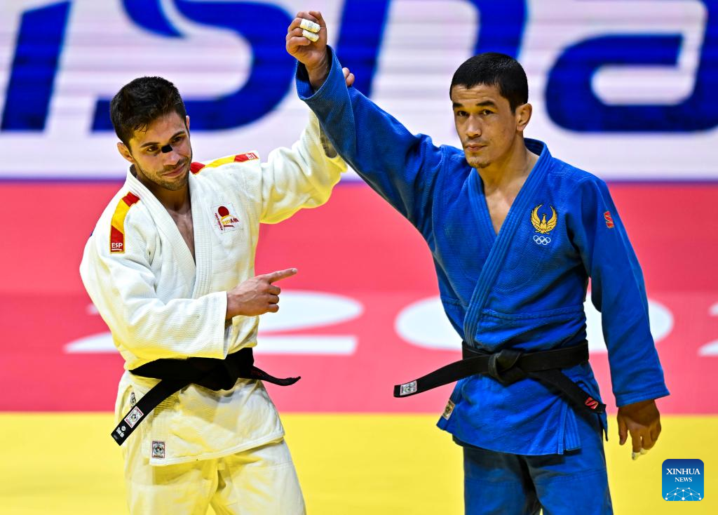 Dilshodbek Baratov (R) of Uzbekistan and Francisko Garrigos of Spain react after the men's 60kg category final at the World Judo Championships Doha 2023 in Doha, Qatar on May 7, 2023. (Photo by Nikku/Xinhua)