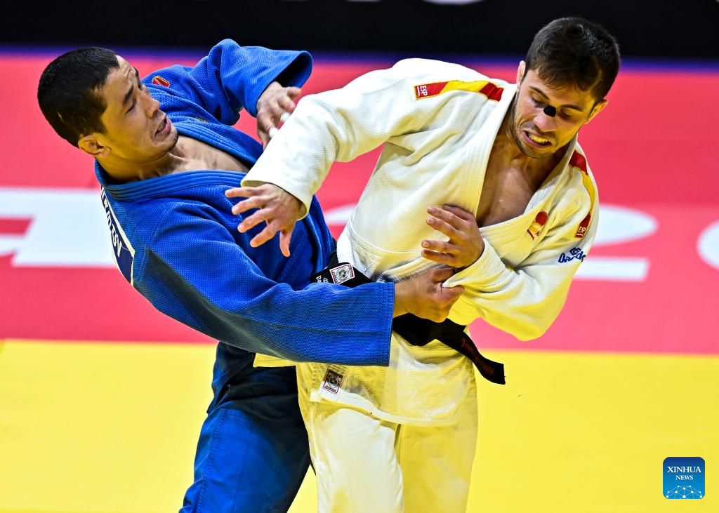 Dilshodbek Baratov (L) of Uzbekistan and Francisko Garrigos of Spain compete during the men's 60kg category final at the World Judo Championships Doha 2023 in Doha, Qatar on May 7, 2023. (Photo by Nikku/Xinhua)