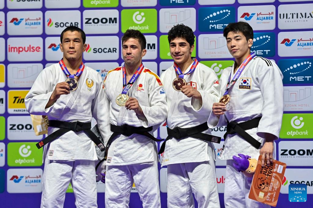 Gold medalist Francisco Garrigos (2nd L) of Spain, silver medalist Dilshodbek Baratov (1st L) of Uzbekistan, bronze medalists Giorgi Sardalashvili (2nd R) of Georgia and Lee Harim of South Korea pose on the podium during the awarding ceremony of the men's 60kg category match at the World Judo Championships Doha 2023 in Doha, Qatar on May 7, 2023. (Photo by Nikku/Xinhua)