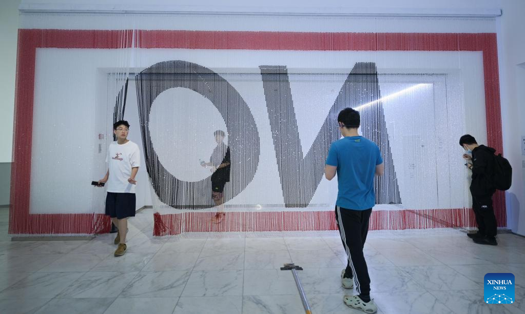 Visitors view a piece of artwork named "ON" at 2023 China Central Academy of Fine Arts (CAFA) postgraduate works exhibition in Beijing, capital of China, May 9, 2023. Over 3,000 pieces of postgraduate works were displayed in the exhibition, including paintings, sculptures, digital art, etc. (Xinhua/Yin Dongxun)