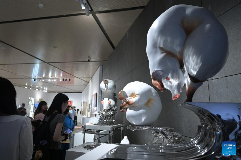 Visitors view sculptures at 2023 China Central Academy of Fine Arts (CAFA) postgraduate works exhibition in Beijing, capital of China, May 9, 2023. Over 3,000 pieces of postgraduate works were displayed in the exhibition, including paintings, sculptures, digital art, etc. (Xinhua/Yin Dongxun)